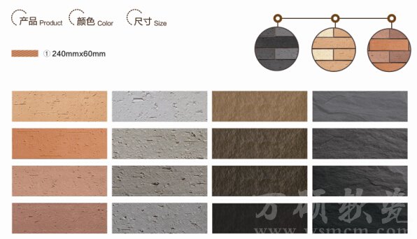 万硕软瓷砖采用MCM(改性土)生态材料已成功推出生态石材、生态劈开砖、生态墙纸等墙材和地板产品,真实自然,阻燃、透气、不变色。从生产到运用,相对于石材、陶瓷砖,节能降耗了80%以上,100%可降解,还原耕土。